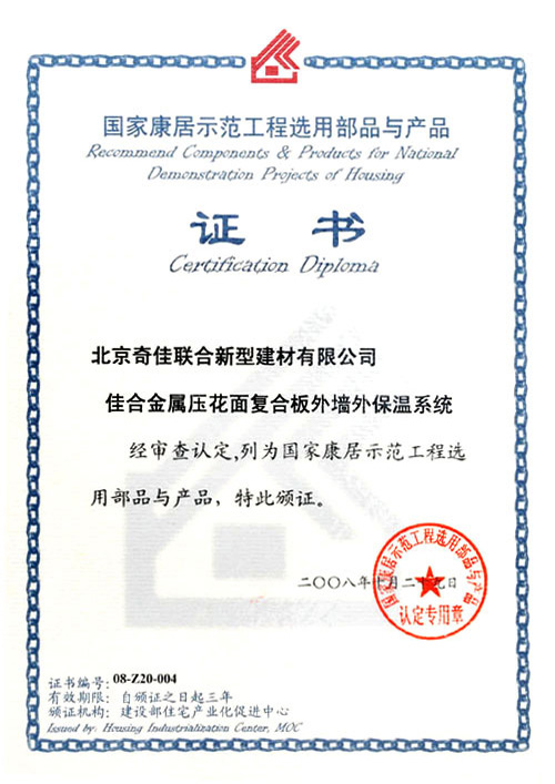 • 2008年被選入“國(guó)家康居示范工程選用部品與產(chǎn)品”