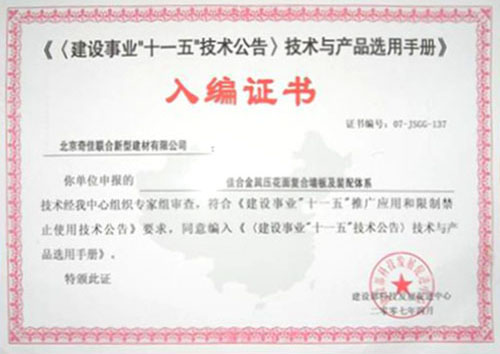 • 2007年被選入《建設(shè)業(yè)“十一五” 技術(shù)公告技術(shù)與產(chǎn)品選用手冊(cè)》